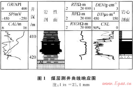 由于煤巖所具有的特殊屬性,煤層的測井響應(yīng)很特殊,比圍巖較易識(shí)別,具體表現(xiàn)為“三高兩低”的特征,即:高電阻、高聲波時(shí)差、高中子、低伽馬、低體積密度(圖1)。