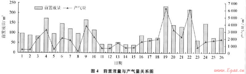 在韓城地區(qū),通過對33口井(其中30口使用活性水壓裂液,3口井使用清潔壓裂液)的排采效果進(jìn)行統(tǒng)計(jì)分析,結(jié)果表明:采用活性水壓裂液壓裂的井比用清潔壓裂液的井產(chǎn)氣效果好;產(chǎn)氣量和前置液量具有很好的正相關(guān)關(guān)系(圖4);加砂量和產(chǎn)氣量也具有一定的正相關(guān)關(guān)系,但砂比和產(chǎn)氣量之間沒有很明顯的相關(guān)性。