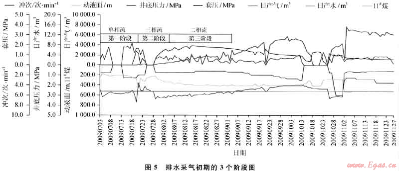 根據(jù)韓城地區(qū)的實(shí)際條件,經(jīng)過不斷摸索,制訂出適合于韓城地區(qū)的一套排采制度:①在排采初期第一階段,低排采強(qiáng)度持續(xù)10~15d,使地層重新建立壓力場平衡,掌握地層的供液能力;②在第二階段,井底流壓接近煤層臨界解吸壓力,這是排采初期的關(guān)鍵時(shí)刻,應(yīng)適當(dāng)加大排采強(qiáng)度,盡可能地將近井地帶的煤粉和壓裂過程中形成的遠(yuǎn)端煤粉排出,疏通近井地帶的高滲流通道;③第三階段主要是氣、液兩相滲透率反復(fù)變更階段(圖5),排采時(shí)應(yīng)保持液面的平穩(wěn)下降,不能造成壓力激動(dòng)而打破地下重新形成的壓力場,導(dǎo)致遠(yuǎn)端滲流通道閉合,滲透率降低,這一過程一般持續(xù)時(shí)間達(dá)一個(gè)月。