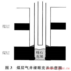 裸眼完井(圖3)是指將套管下在生產(chǎn)段煤層頂,然后鉆開煤層,不進(jìn)行壓裂等增產(chǎn)措施,產(chǎn)氣煤層保持裸眼或用礫石充填。裸眼完井是一種最基本、最簡單、費(fèi)用最低的完井方式,適合于埋深較淺、滲透性能好的單目的層,煤儲(chǔ)層穩(wěn)定且不容易垮塌。