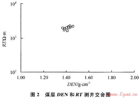在相同程度的煤化作用下,電阻率一般反映煤巖成分和煤質(zhì),電阻率越高,表明煤層灰分越低,煤質(zhì)越好,絲炭含量和煤層受氧化是煤層電阻率降低的主要因素,低電阻往往也就直接反映了相對低的煤層含氣量;聲波時(shí)差值顯示了煤層的壓實(shí)程度和孔隙;補(bǔ)償中子則表示煤巖的含氫指數(shù);補(bǔ)償密度則指示煤巖的變質(zhì)程度和含氣量。從測井交會(huì)圖(圖2)中可以看出,該煤層的測井響應(yīng)反映出了絲炭含量低、灰分中等、弱含水的特征。