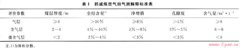 地質(zhì)錄井是煤層氣勘探開發(fā)中最常應(yīng)用的錄井技術(shù),包括鉆時(shí)、巖屑、巖(煤)心、鉆井液性能、氣測等項(xiàng)目的錄取工作。其中,氣測錄井是指直接測定鉆井液攜帶的破碎煤層中可燃性氣體含量的一種測井方法,然后根據(jù)氣層解釋標(biāo)準(zhǔn)(表1),結(jié)合巖石電性特征,判定氣測異常層是氣層還是含氣層。