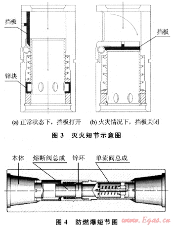 滅火短節(jié)(見圖3、圖4),即鉆柱防火接頭,這是一種低熔點合金制造的閥件,即滅火浮閥,閥內裝有一個鋅環(huán)。在正常情況下,循環(huán)的空氣流動壓力使彈簧瓣向下張開,允許空氣循環(huán)通過。一旦環(huán)空著火,溫度上升,當超過設計溫度時,低熔點合金鋅環(huán)熔化使一個襯套封住空氣流道,關閉閥門,停止向井底循環(huán)補充空氣,從而切斷氣源使火熄滅。