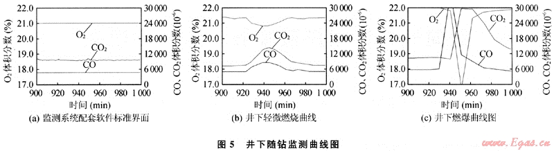 井下隨鉆監(jiān)測系統(tǒng)是專門為監(jiān)測井下燃爆現(xiàn)象而開發(fā)研制的。目前,在現(xiàn)場使用比較成熟的是西南石油大學研制的UBD氣體監(jiān)測系統(tǒng),其主要原理是在監(jiān)測到烴類氣體的情況下,通過對返出氣體中O2、CO2、和CO體積分數(shù)變化的監(jiān)測來判斷井下是否發(fā)生燃爆。一旦發(fā)生井下燃爆,由于井下燃燒為不完全燃燒,返出氣體中的CO2、CO氣體體積分數(shù)會升高,而O2氣體體積分數(shù)會降低。圖5是3種情況下監(jiān)測界面圖的對比[2]。