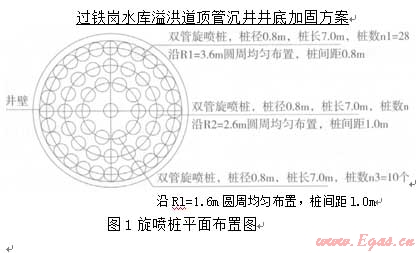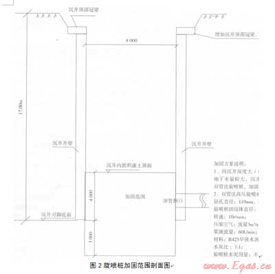 要加同沉井內(nèi)虛土,首先想到的是旋噴樁。眾所周知,旋噴樁是一種適合于加固軟土的很好地基處理方法,但其施工一般是在地面上進(jìn)行。旋噴樁若要在深度達(dá)l7m、而其中上部還要架空約13m的沉井內(nèi)施工卻是從未曾有人嘗試過。旋噴樁施工隊(duì)伍也擔(dān)心架空l3m可能無法施工、加固效果很難保證。經(jīng)過仔細(xì)分析,我們大膽提出,只要采取的措施得法,旋噴樁是可以用于加固沉井內(nèi)虛土并起到止水作用的。通過現(xiàn)場指導(dǎo)施工,落實(shí)各項(xiàng)施工措施,最終證明,旋噴樁加固效果良好,虛土加同后,井底未出現(xiàn)涌砂、涌土現(xiàn)象,順利清除了井底虛土,保證了沉井順利封底。見圖l、圖2。
