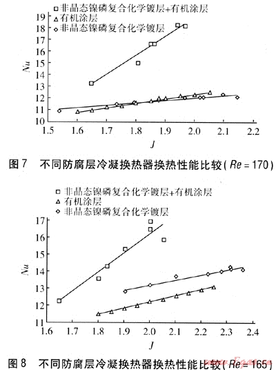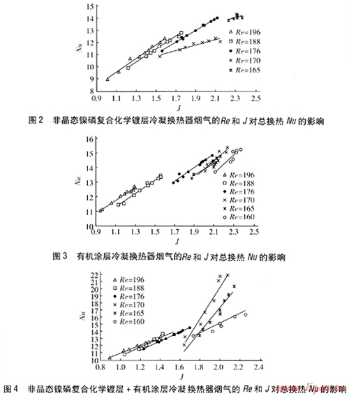 ③ 有機(jī)涂層冷凝換熱器換熱能力在船大時(shí),高于非晶態(tài)鎳磷復(fù)合化學(xué)鍍層冷凝換熱器,是由于有機(jī)涂層可使煙氣在其表面趨于珠狀凝結(jié),改善換熱;在Re小時(shí),換熱能力低于非晶態(tài)鎳磷復(fù)合化學(xué)鍍層冷凝換熱器,是由于形成的液珠在換熱器肋片間搭液橋,使得有機(jī)涂層換熱器換熱能力較低;在Re由大到小的過程中,兩者的換熱能力相差不大,J越大,有機(jī)涂層冷凝換熱器換熱能力越強(qiáng),回收的潛熱量越多。