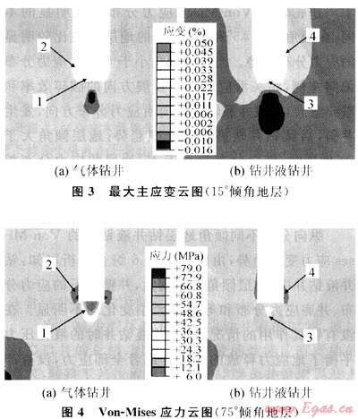 從圖2中2、4區(qū)井壁巖石的應(yīng)力分布可見,井壁左側(cè)巖石的Von-Mises應(yīng)力值大于右側(cè)井壁巖石的應(yīng)力值,井壁巖石的應(yīng)力分布是不對(duì)稱的,沿傾斜面的更高一側(cè)井壁應(yīng)力值更大。氣體鉆井中井壁巖石在井底附近出現(xiàn)明顯的應(yīng)力集中,Von-Mises應(yīng)力值最大為79MPa,而鉆井液鉆井在4區(qū)出現(xiàn)的井壁巖石應(yīng)力集中的Von-Mises應(yīng)力值約為70MPa。氣體鉆井在2區(qū)井壁巖石的應(yīng)力區(qū)域面積比鉆井液鉆井4區(qū)的等值應(yīng)力分布面積更大。由此可見,相同的巖層和巖石強(qiáng)度,氣體鉆井的井壁比鉆井液鉆井時(shí)更容易成塊掉落,形成坍塌型井眼,造成鉆柱力學(xué)變化,改變井斜規(guī)律。從圖3中還可以看出,氣體鉆井1區(qū)主應(yīng)力大于3區(qū),說(shuō)明氣體鉆井條件下機(jī)械鉆速高,破巖速度也快。氣體鉆井2區(qū)沿左側(cè)井壁巖石比沿右側(cè)井壁巖石具有更大的拉應(yīng)變,如果巖石出現(xiàn)裂縫,將最先在左側(cè)出現(xiàn),而且較右側(cè)更大,巖石的破碎、跨塌將首先出現(xiàn)在左側(cè)。鉆井液鉆井出現(xiàn)相同趨勢(shì)的現(xiàn)象,但是井壁巖石有鉆井液的保護(hù),使得4區(qū)井壁巖石的應(yīng)變小而且分布均勻,其井壁穩(wěn)定性好,在相同巖石情況下,不會(huì)出現(xiàn)嚴(yán)重的坍塌型井眼,不會(huì)影響井斜的發(fā)展規(guī)律。由圖4可見,氣體鉆井1區(qū)井底巖石應(yīng)力分布向右面偏斜,即沿向平行于傾斜面的方向偏斜,而鉆井液鉆井的偏斜趨勢(shì)基本相同,但不明顯。氣體鉆井的井底巖石相同等值線應(yīng)力區(qū)域面積較鉆井液鉆井的應(yīng)力區(qū)域面積更大。由于氣體鉆井破巖效率較高,使井眼的傾斜幅度也產(chǎn)生了放大的作用,破壞巖石后形成的井眼有向右面偏斜的趨勢(shì)。