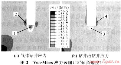 從井壁巖石的應(yīng)力分布可見,左側(cè)井壁巖石的Von-Mises應(yīng)力分布與右側(cè)井壁巖石的應(yīng)力分布差別較大,氣體鉆井2區(qū)井壁巖石出現(xiàn)應(yīng)力集中,最大值為79MPa,比鉆井液鉆井4區(qū)井壁巖石應(yīng)力值大,而且等值應(yīng)力分布面積更大,由此可見,相同的巖層和巖石強(qiáng)度,氣體鉆井的井壁比鉆井液鉆井時(shí)更不穩(wěn)定,更容易出現(xiàn)井壁不穩(wěn)定現(xiàn)象,鉆進(jìn)時(shí)更容易出現(xiàn)井眼擴(kuò)大,與15°傾斜地層有相同的趨勢(shì)和結(jié)果。