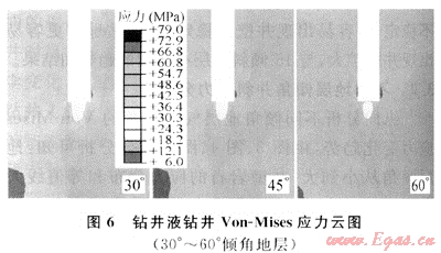 橫向比較分析不同傾角地層氣體鉆井和鉆井液鉆井的Von-Mises應(yīng)力變化趨勢(shì),由圖3、圖4、圖5、圖6綜合分析可見:氣體鉆井井壁巖石在井底附近出現(xiàn)應(yīng)力集中,比鉆井液鉆井井壁巖石應(yīng)力值大,而且等值應(yīng)力分布面積更大,氣體鉆井比鉆井液鉆井更容易出現(xiàn)井壁不穩(wěn)定現(xiàn)象。氣體鉆井井底巖石相同等值線應(yīng)力區(qū)域面積較鉆井液鉆井應(yīng)力區(qū)域更深,巖石破壞范圍要大于鉆井液鉆井的破壞范圍,大大提高了破壞巖石效率和鉆井速度。在相同條件下,如果井眼軌跡發(fā)生偏斜,由于氣體鉆井具有較好的破巖效率,產(chǎn)生井斜可能性和幅度都更大。