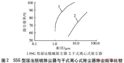SSG型濕法脫硫除塵器與干式離心式除塵器除塵效率比較見圖2。由圖2可知,對(duì)于粒徑為1~10μm的飄塵,SSG型濕法脫硫除塵器的除塵效率為60%~100%;對(duì)于粒徑為6~10μm的飄塵,干式離心式除塵器的除塵效率為55%~70%;而對(duì)于粒徑為6μm以下的飄塵,干式離心式除塵器幾乎沒有捕集能力。SSG型濕式除塵器除塵效率曲線總是位于干式離心式除塵器除塵效率曲線的上方,無論對(duì)于何種粒徑的煙塵,SSG型濕法除塵器的除塵效率均大于干式離心式除塵器。