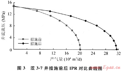 3-7井在2002年10月12日實(shí)施高壓一次充填作業(yè),并且分別在防砂前2002年8月1日和防砂后2002年11月1日進(jìn)行了產(chǎn)能試井,對(duì)試井資料使用一般單點(diǎn)法、指數(shù)式單點(diǎn)法和二次單點(diǎn)法進(jìn)行分析處理,得出措施前后的IPR對(duì)比曲線(圖3)。