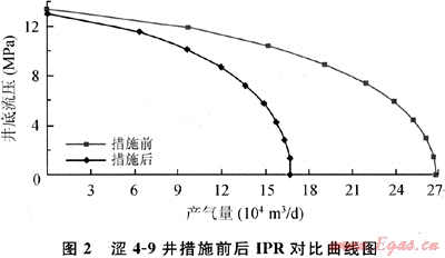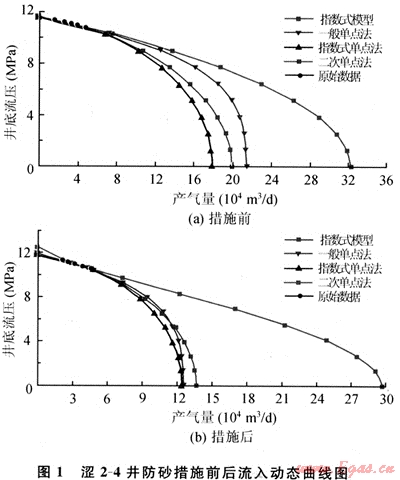 4-9井在2003年9月28日實(shí)施高壓一次充填作業(yè),并且分別在防砂前20Q3年8月12日和防砂后2003年11月24日進(jìn)行了產(chǎn)能試井,對(duì)試井資料使用一般單點(diǎn)法、指數(shù)式單點(diǎn)法和二次單點(diǎn)法進(jìn)行分析處理,得出措施前后的IPR對(duì)比曲線如圖2所示。