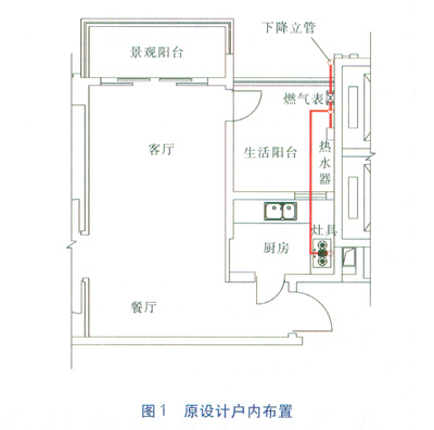 某樓盤(pán)所有戶(hù)型都是房地產(chǎn)精裝修,一些戶(hù)型的廚房位于進(jìn)戶(hù)大門(mén)旁,廚房的窗口外面是敞開(kāi)式生活陽(yáng)臺(tái),客廳和餐廳左側(cè)是兩房間,燃?xì)饬⒐馨惭b在敞開(kāi)式生活陽(yáng)臺(tái)外側(cè),燃?xì)獗砗蜔崴饕差A(yù)先安裝在敞開(kāi)式生活陽(yáng)臺(tái)上,燃?xì)獗砬叭細(xì)夤艿兰芸辗笤O(shè)在敞開(kāi)式生活陽(yáng)臺(tái)的墻上,表后管道采用銅管直埋于墻壁,并沿墻壁下來(lái)直接進(jìn)入地板內(nèi)敷設(shè),從而連接熱水器和燃?xì)庠?。這種布置方式是符合規(guī)范要求的。原設(shè)計(jì)戶(hù)內(nèi)布置見(jiàn)圖1。