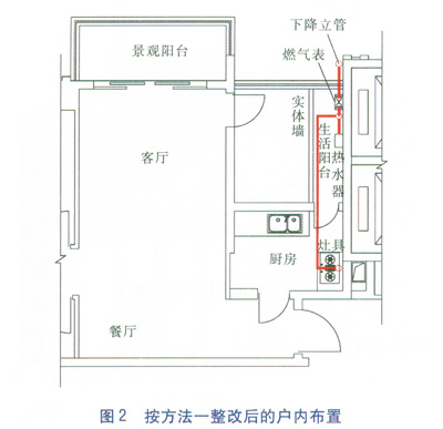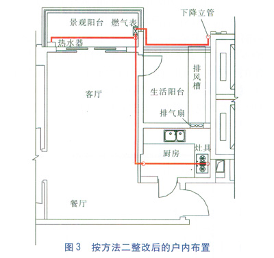 由于后期個(gè)別業(yè)主將敞開(kāi)式生活陽(yáng)臺(tái)封閉作為臥室,這樣造成燃?xì)庠O(shè)施安裝在臥室內(nèi),且廚房變成了暗廚房。GB 50028-2006第10.4.2條規(guī)定,居民生活用氣設(shè)備嚴(yán)禁設(shè)置在臥室內(nèi)。因此,這種戶(hù)型若需通氣,必須經(jīng)過(guò)整改。我們采取了兩種方法。