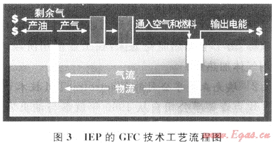 該工藝流程(圖3)為:利用高溫燃料電池堆的反應(yīng)熱直接加熱油頁(yè)巖層,使其中的有機(jī)質(zhì)熱解產(chǎn)生烴氣,然后導(dǎo)入到采油井,被抽到地面上來(lái)。除了部分氣體作為燃料被通入燃料電池堆外,其余大部分烴氣經(jīng)冷凝后獲得石油和天然氣。另外,在啟動(dòng)工藝裝置預(yù)熱油頁(yè)巖時(shí)期,需要向燃料電池中通入天然氣作為啟動(dòng)燃料。工藝正常運(yùn)轉(zhuǎn)后,能量自給自足[9]。