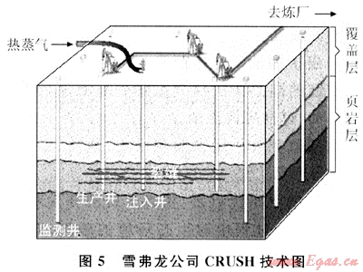 2006年,雪弗龍公司和Los Alamos國(guó)家實(shí)驗(yàn)室聯(lián)合開發(fā)了CRUSH技術(shù),并將根據(jù)設(shè)計(jì)的含有2~5個(gè)四點(diǎn)井網(wǎng)單元的工業(yè)試驗(yàn)?zāi)P?,進(jìn)行實(shí)驗(yàn)室室內(nèi)實(shí)驗(yàn)和小規(guī)模的現(xiàn)場(chǎng)試驗(yàn)。目前主要研究注入高溫CO2加熱油頁(yè)巖層技術(shù)(圖5)。該技術(shù)首先對(duì)頁(yè)巖層進(jìn)行爆破壓裂,提高CO2與干酪根接觸的表面積,將CO2以對(duì)流的方式從豎直井導(dǎo)入,通過(guò)一系列水平裂縫加熱頁(yè)巖層。生成的烴氣經(jīng)垂直井采出。該技術(shù)是基于1950年代Sinclair油氣公司利用垂直井間自然和引導(dǎo)的裂縫開采地下干酪根的試驗(yàn)開發(fā)的[12]。康菲石油公司和阿克倫大學(xué)的研究表明:CO2是一種能使頁(yè)巖油很好回收的載體,并申請(qǐng)了專利[12]。該技術(shù)需要大量水,并進(jìn)行現(xiàn)場(chǎng)生產(chǎn),對(duì)環(huán)境破壞較大[13]。