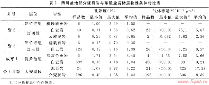 從資2井筇竹寺組底部所取的幾塊黑色粉砂質(zhì)頁(yè)巖樣品的物性分析結(jié)果來(lái)看,其孔隙度在1%~2.5%之間,明顯高于緊伏其下的震旦系燈四段的白云巖,其平均值也高于資3井燈三段白云巖層(表2)。威001-2井的測(cè)井解釋結(jié)果也表明,筇竹寺組2982.75m以下頁(yè)巖段的孔隙度在0.69%~3.08%,平均值為1.64%,滲透率在0.001×10-3~0.11×10-3μm2,平均值為0.019×10-3μm2。因此,盡管頁(yè)巖儲(chǔ)層超低孔、致密,但仍具備一定的儲(chǔ)集條件。