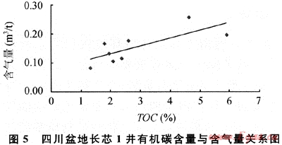 頁巖氣的勘探生產價值取決于其中游離氣和吸附氣的含量,游離氣的含量高低與其構造保存條件密切相關,而吸附氣含量受溫度、壓力等環(huán)境因素影響,在相同情況下,吸附氣量高低與有機質含量呈正相關。上揚子地區(qū)志留系烴源巖有機質豐度高,預計將會在構造保存條件差異較大的地區(qū)分別形成不同含氣量及含氣特點的頁巖氣聚集。在四川盆地,除已發(fā)現過去的老井在鉆探志留系頁巖段時具有豐富的氣顯示之外,目前完鉆的長芯1井初步分析結果顯示,在埋深淺于150 122龍馬溪組頁巖層段內,同樣發(fā)現了頁巖氣存在的證據(表2)。8個頁巖巖心的含氣量實驗結果顯示(解析溫度70℃),每噸巖石含氣量為0.08~0.25m3,平均為0.15m3/t。另從110m和120m巖樣的甲烷碳同位素分別為-40.2‰和-52.3‰來看,頁巖氣應為熱成因的天然氣。有機質豐度與含氣量的關系則顯示(圖5),同美國頁巖一樣,同樣具有有機碳含量與含氣量呈正相關的關系,即有機質豐度越高,含氣量越大。
