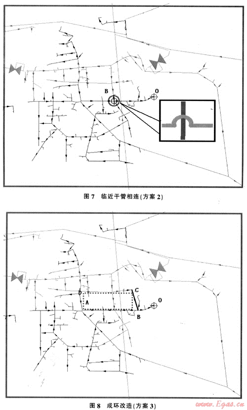 如表3所述,在現(xiàn)有管線基礎(chǔ)上,增加管線建設(shè)來提高壓力的方法有并行管線,加連通線和管網(wǎng)成環(huán)。但如何使建設(shè)最短的管線達(dá)到最大的效果,這就需要對(duì)管網(wǎng)進(jìn)行模擬仿真計(jì)算。下面以某一天然氣供應(yīng)區(qū)為例進(jìn)行分析。