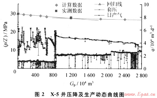 選取儲(chǔ)層物性好,可動(dòng)儲(chǔ)量偏低的氣井重復(fù)改造,提高儲(chǔ)量動(dòng)用程度。X-5井測井解釋儲(chǔ)層物性相對較好,有效厚度7m,滲透率0.33×10-3μm2,孔隙度5.8%,初期產(chǎn)氣1.0×104m3/d,只能間歇生產(chǎn),評價(jià)可動(dòng)儲(chǔ)量僅1.13×108m3;2004年10月對該井進(jìn)行二次酸壓改造,產(chǎn)氣提高到2.0×104m3/d,評價(jià)該井可動(dòng)儲(chǔ)量為2.34×108m3(圖2)。