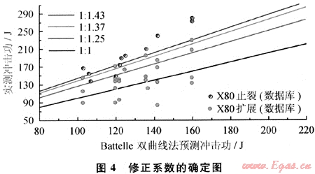 新頒布的ISO 3183 2007中給出了幾種常用的止裂韌性預(yù)測方法的適用范圍(見表2)。可見,對(duì)于西二線,只有Battelle雙曲線法適用。ISO 3183—2007進(jìn)一步指出,當(dāng)預(yù)測結(jié)果大于100J時(shí),應(yīng)對(duì)預(yù)測結(jié)果進(jìn)行修正。而修正系數(shù)是由已經(jīng)進(jìn)行的全尺寸實(shí)物爆破試驗(yàn)結(jié)果確定的。由圖4得出西二線止裂韌性修正系數(shù)為1.43。幾種預(yù)測結(jié)果對(duì)比如表3所示。