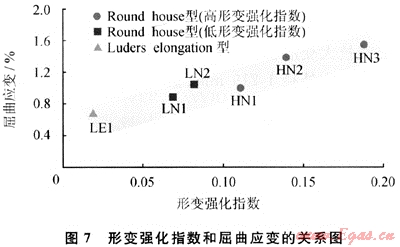鋼管在塑性變形過程中產(chǎn)生的形變強(qiáng)化,可以阻止進(jìn)一步變形的發(fā)生,防止變形的局部集中。這一過程可以通過形變強(qiáng)化指數(shù)表征。提高管材的形變強(qiáng)化指數(shù)是提高輸送管變形能力的有效途徑(圖7)[13~14]。對(duì)于具有較高變形能力的管線鋼,其形變強(qiáng)化指數(shù)一般大于0.1。