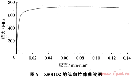 用于西二線的抗大變形鋼管已試制成功。表4是西二線抗大變形管線鋼技術(shù)條件對(duì)縱向拉伸性能的要求。表5為外徑1219mm、壁厚22mm X80HD2鋼管的縱向拉伸性能測試結(jié)果。9為其縱向拉伸曲線。根據(jù)此拉伸曲線,利用FEM(Finite Element Method)方法進(jìn)行壓縮和彎曲載荷下的應(yīng)變能力計(jì)算,結(jié)果見表6。