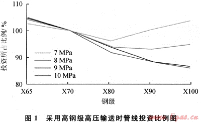 在日益激烈的市場競爭中,全球各石油公司都在不斷尋找降低成本的途徑。在管線項(xiàng)目投資中,鋼管的成本占40%左右,采用高鋼級(jí)管線鋼管可以減小壁厚,高壓輸送可以在不改變輸量的情況下減小管徑。管徑和壁厚的減小可帶來工程費(fèi)用的降低。因此,采用高鋼級(jí)管線鋼管和高壓輸送可有效降低輸送成本。在1998年舉行的國際管道會(huì)議上,加拿大的NOVA公司介紹了該公司采用高鋼級(jí)管線鋼管和高壓輸送的效益情況[5]。圖1所示為采用不同鋼級(jí)管線鋼管和不同輸送壓力時(shí)管線的投資對(duì)比情況[5]??梢?,在高壓輸送時(shí),采用高鋼級(jí)管線鋼管可明顯降低管道成本。