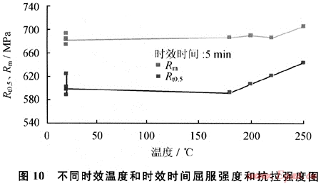 應(yīng)變時(shí)效是鋼經(jīng)過冷塑性變形后,在室溫長時(shí)間放置或稍加熱后,其力學(xué)性能發(fā)生變化(通常是屈服強(qiáng)度增高,屈強(qiáng)比提高,并伴有塑性和韌性降低)現(xiàn)象。原因是存在于鋼中的溶質(zhì)組元如C、N原子通過擴(kuò)散在位錯(cuò)周圍偏聚,形成柯氏(Cottrell)氣團(tuán),使位錯(cuò)運(yùn)動(dòng)變得困難,導(dǎo)致屈服強(qiáng)度升高。圖10為X80鋼管在不同時(shí)效條件下屈服強(qiáng)度和抗拉強(qiáng)度的變化情況。由圖10可見,隨著時(shí)效溫度升高和時(shí)效時(shí)間的延長,鋼管的抗拉強(qiáng)度變化不明顯,但屈服強(qiáng)度則明顯上升。在實(shí)際防腐過程中,時(shí)間一般只有5min左右。而從試驗(yàn)結(jié)果來看,防腐溫度在200℃以下時(shí),屈服強(qiáng)度沒有明顯變化。因此可以規(guī)定防腐時(shí)的加熱溫度不宜超討200℃。