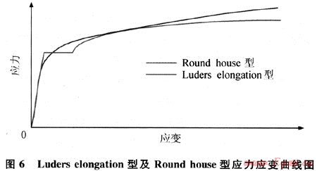 典型的管線鋼應(yīng)力應(yīng)變曲線有Luders elongation型及Round house型兩種,如圖6所示。研究表明,Round house型管線鋼的變形能力優(yōu)于Luders elongation型管線鋼[12],其屈曲應(yīng)變遠(yuǎn)高于Luders elongation型管線鋼。