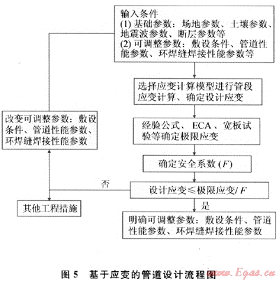 中石油《西氣東輸二線工程關(guān)鍵技術(shù)研究》重大專項(xiàng)設(shè)置課題研究了西二線基于應(yīng)變的設(shè)計(jì)方法并進(jìn)行了抗大變形管線鋼的研究與開發(fā)。中石油規(guī)劃設(shè)計(jì)總院和管道設(shè)計(jì)院編制了《西氣東輸二線管道工程強(qiáng)震區(qū)和活動(dòng)斷層區(qū)段埋地管道基于應(yīng)變?cè)O(shè)計(jì)導(dǎo)則》[10~11]。基于應(yīng)變的管道設(shè)計(jì)流程如圖5所示。核心環(huán)節(jié)是設(shè)計(jì)應(yīng)變小于等于極限應(yīng)變/安全系數(shù)。此處的極限應(yīng)變就是鋼管應(yīng)力-應(yīng)變曲線中的屈曲應(yīng)變。它可以直接由鋼管實(shí)物試驗(yàn)測出,也可由經(jīng)驗(yàn)公式、ECA(Engineer Critical Assessment)、寬板試驗(yàn)等確定。