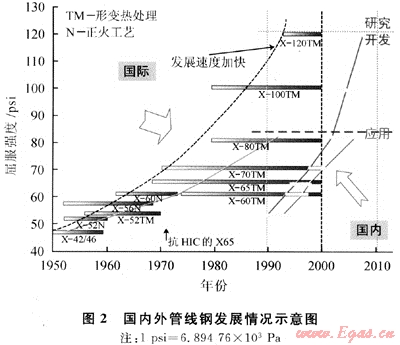 提高管線鋼管鋼級(jí)和輸送壓力是天然氣管道建設(shè)強(qiáng)勁的發(fā)展趨勢,API標(biāo)準(zhǔn)的發(fā)展也反映了這種趨勢。圖2為我國與發(fā)達(dá)國家管線鋼發(fā)展情況對(duì)比示意圖[6]。20世紀(jì)90年代之前,我國天然氣管道普遍采用A3、16Mn、TS52K等低強(qiáng)度焊管,輸送壓力大都在4MPa以下。我國按API標(biāo)準(zhǔn)生產(chǎn)和使用管線鋼管比發(fā)達(dá)國家滯后約40年。1993年,陜京管線采用X60鋼級(jí)、6.4MPa壓力,縮小了與發(fā)達(dá)國家的差距;2000年,西氣東輸(為便于區(qū)別,以下稱為西氣東輸一線)管線采用X70鋼級(jí)、10MPa壓力,跟上了發(fā)達(dá)國家的步伐;現(xiàn)在,西氣東輸二線干線全部采用X80鋼級(jí),西段采用12MPa設(shè)計(jì)壓力,使我國管道建設(shè)跨上了新的臺(tái)階。就全球已經(jīng)建成和正在建設(shè)的X80輸氣管道而言,無論是設(shè)計(jì)壓力、管道長度,還是管徑、壁厚,西氣東輸二線(簡稱西二線)均堪稱世界之最。