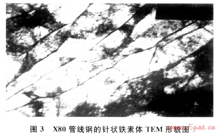 所謂針狀鐵素體型管線鋼,并不是必須100%的針狀鐵素體,而是針狀鐵素體、粒狀貝氏體和少量塊狀鐵素體等的混合組織。對(duì)于這種類型管線鋼的組織目前尚無統(tǒng)一的術(shù)語。鑒于針狀鐵素體(又稱板條貝氏體鐵素體)和粒狀貝氏體都屬于貝氏體范疇。因此也有人把針狀鐵素體鋼稱為貝氏體鋼。圖3是X80針狀鐵素體型管線鋼TEM(透射電子顯微鏡)形貌。