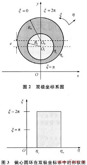 在直角坐標系中,偏心圓的幾何形狀是不規(guī)則的,為了使邊界條件簡化,引入雙極坐標系;ξ和η為雙極坐標系的坐標分量,η從-∞到+∞;ξ從0到2π,可以覆蓋全平面;e為偏心距,即兩圓圓心的距離[5~6],如圖2所示。