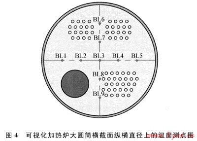為對上述結論加以驗證,進行了大圓筒內(nèi)介質(zhì)流動的可視化流場試驗,試驗目的是對實測數(shù)據(jù)和觀察到的情況進行分析,為加熱爐實物的試驗和實際設計打基礎。考慮到大圓筒內(nèi)流場分布可能較紊亂,因此采用可視手段,目的是能夠觀察到流場的基本動向。試驗用可視化加熱爐大圓筒外殼由有機玻璃構成,火筒和煙管束由黃銅制成,布置于大圓筒下方,用電加熱器加熱空氣模擬煙氣流入火筒經(jīng)轉向室流入煙管束然后排入大氣,電加熱器采用2kW、4kW、6kw的功率,由此形成熱風循環(huán)系統(tǒng);大圓筒內(nèi)中間載熱介質(zhì)采用水,因水量較大,為使試驗時介質(zhì)水的溫度能迅速達到要求,設計了預熱水系統(tǒng),即專門配備了預熱水箱,內(nèi)有電加熱器能較快地加熱介質(zhì)水,使其達到預定溫度后再注入大圓筒內(nèi);對流管束受熱面由紫銅管制成,布置于大圓筒上方,對流管束彎成“U”型,一端為進口,一端為出口,被加熱流體為空氣,為控制其初始溫度,在冷風系統(tǒng)中配有空調(diào)器以降低空氣溫度。為測量大圓筒圓截面上流場的溫度分布,在圓截面的縱軸和橫軸上布置了溫度測點,編號分別為BL1~9,如圖4所示。試驗時同時開啟冷風及熱風循環(huán)系統(tǒng),并通過預熱水系統(tǒng)將大圓筒內(nèi)中間載熱介質(zhì)水的溫度控制在41.7℃和63℃,以觀察流場,并測試不同加熱功率對大圓筒內(nèi)水溫的影響。