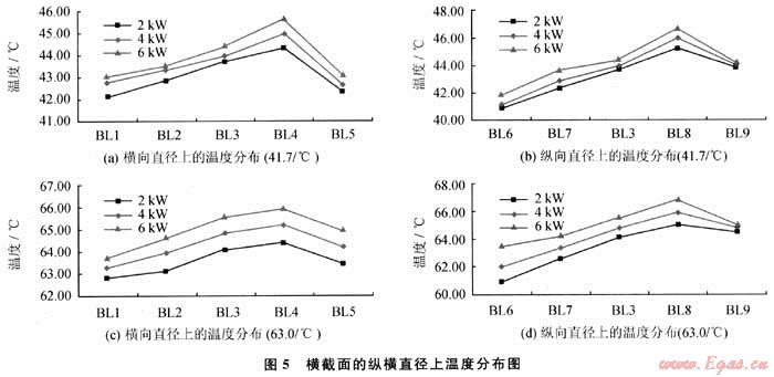 測試結果由圖5所示,在不同的加熱功率下,橫軸上測點BL4的溫度最高,縱軸上測點BL8的溫度最高,因為這兩個測點離火筒位置最近,而火筒是模擬煙氣的入口,氣流溫度最高,測點BL3至BL4的溫度變化幅度在中間載熱介質(zhì)水溫為41.7℃時比為63℃時大,其原因是介質(zhì)水溫較低時,與火筒內(nèi)的氣流溫差較大,使火筒壁面附近對流換熱加大,介質(zhì)水溫上升快,因此火筒周圍形成了較強的上升流;而介質(zhì)水溫為63℃時,由于介質(zhì)與氣流間的溫差較小,對流換熱相對弱,上升流的動力也小??v軸上各測點溫度顯示:在不同的加熱功率和中間載熱介質(zhì)溫度下,溫度分層現(xiàn)象明顯,測點BL8溫度最高,自BL3、BL7至BL6依次降低,而BL9比BL8低,但高于其他測點,這與流場換熱狀況相吻合;測點BL6的溫度,在加熱功率較小時,會低于介質(zhì)溫度,表明在此附近區(qū)域加熱氣流提供的熱量不足,被加熱氣流只能吸收中間載熱介質(zhì)的初始熱量達到升溫的目的。試驗結果證實了數(shù)值計算反映的大圓筒中間載熱介質(zhì)天然氣加熱爐流場中存在的問題。