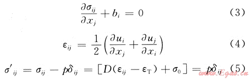 與常規(guī)應(yīng)力應(yīng)變方程相比,式(5)增加了熱應(yīng)變項(xiàng)、初始地應(yīng)力項(xiàng)和流體壓力項(xiàng),以表征3個(gè)物理場(chǎng)之間的耦合作用。