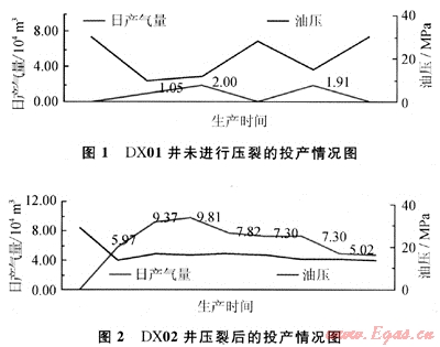 火山巖氣藏的探井要通過(guò)水力加砂壓裂改造,才能獲得較高的產(chǎn)能。因此水力壓裂是克拉美麗氣田氣井射后誘噴不出的有效手段。通過(guò)優(yōu)化壓裂工藝,氣田投產(chǎn)的9口井初期均取得了良好的生產(chǎn)效果。其中DX01和DX02井是井區(qū)最后投產(chǎn)的兩口井,由于冬季壓裂施工難度大,DX01井未進(jìn)行壓裂(圖1),雖然關(guān)井油壓達(dá)30MPa,但開井氣量下降快,無(wú)法連續(xù)生產(chǎn)。DX02井壓裂后生產(chǎn)較為穩(wěn)定(圖2)。