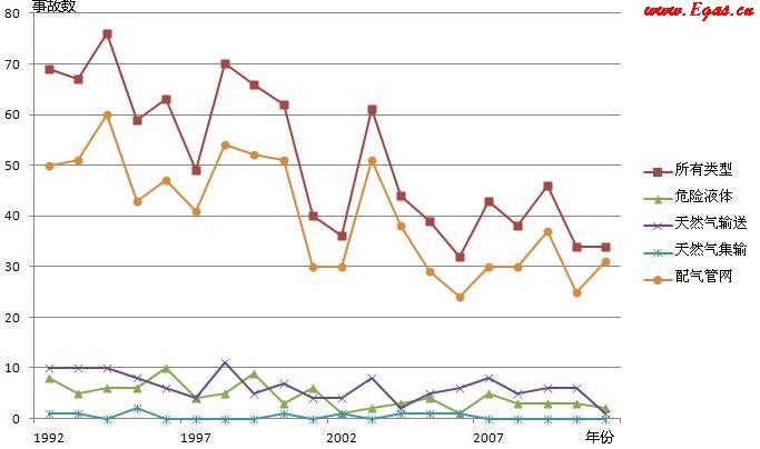 根據(jù)美國PHMSA管道失效數(shù)據(jù)庫統(tǒng)計(jì),管道系統(tǒng)發(fā)生的重特大事故中,約80%是由城鎮(zhèn)燃?xì)夤芫W(wǎng)導(dǎo)致的事故(見圖 1),因此針對(duì)城鎮(zhèn)燃?xì)夤芫W(wǎng)開展完整性管理具有重要意義。美國針對(duì)DIMP的研究從2000年左右開始。2005年管道和危險(xiǎn)材料安全管理局(Pipeline&HazardousMaterialsSafetyAdministration,簡稱PHMSA)、燃?xì)廨斉涔I(yè)協(xié)會(huì)和國家管道安全協(xié)會(huì)共同發(fā)布了《燃?xì)廨斉涔艿劳暾怨芾?mdash;—第一階段調(diào)研報(bào)告》,此后美國有多家相關(guān)的政府機(jī)構(gòu)、協(xié)會(huì)組織和研究機(jī)構(gòu)參與了燃?xì)夤芫W(wǎng)完整性管理的研究工作,并進(jìn)行相關(guān)標(biāo)準(zhǔn)的制定以及完整性管理開展情況的檢查和審查工作。