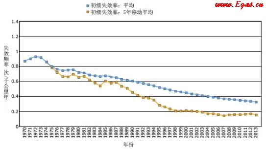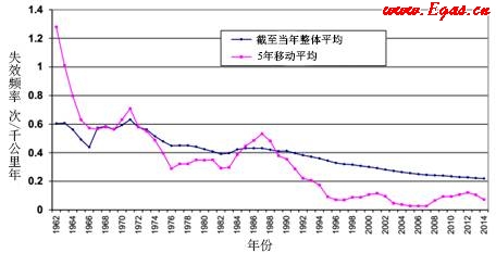 圖13 整體和5年移動平均失效頻率(1962-2014年)