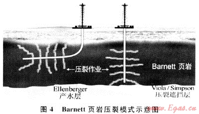作為目前美國最活躍的頁巖氣遠(yuǎn)景區(qū),沃斯堡盆地Barnrtt頁巖的開發(fā)充分說明了直接及時(shí)的微地震描述技術(shù)的重要性[20~21]。經(jīng)營者運(yùn)用該技術(shù)認(rèn)識(shí)到天然裂縫和斷層對(duì)水力壓裂裂縫的延伸及儲(chǔ)層產(chǎn)能和開采產(chǎn)生很大影響。2005年,美國Chesapeak能源公司于將微地震技術(shù)運(yùn)用于一口垂直監(jiān)測井上,準(zhǔn)確地確定了Newark East氣田一口水平井進(jìn)行的4段清水壓裂的裂縫高度、長度、方位角及其復(fù)雜性,改善了對(duì)壓裂效果的評(píng)價(jià)[19]。