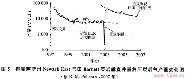 當(dāng)頁巖氣井初始?jí)毫烟幚硪呀?jīng)無效或現(xiàn)有的支撐劑因時(shí)間關(guān)系損壞或質(zhì)量下降,導(dǎo)致氣體產(chǎn)量大幅下降時(shí),重復(fù)壓裂能重建儲(chǔ)層到井眼的線性流,恢復(fù)或增加生產(chǎn)產(chǎn)能,可使估計(jì)最終采收率提高8%~10%,可采儲(chǔ)量增加60%,是一種低成本增產(chǎn)方法。該方法有效地改善單井產(chǎn)量與生產(chǎn)動(dòng)態(tài)特性,在頁巖氣井生產(chǎn)中起著積極作用,壓裂后產(chǎn)量接近甚至超過初次壓裂時(shí)期。美國天然氣研究所(GRI)研究證實(shí),重復(fù)壓裂能夠以0.1美元/mcf(1mcf=28.317m3)的成本增加儲(chǔ)量,遠(yuǎn)低于收購天然氣儲(chǔ)量0.54美元/mcf或發(fā)現(xiàn)和開發(fā)天然氣儲(chǔ)量0.75美元/mcf的平均成本[16]。如圖5所示,得克薩斯州Newark East氣田Barnett頁巖新井完井和老井采用重復(fù)壓裂方法壓裂后,頁巖氣井產(chǎn)量與估計(jì)最終可采儲(chǔ)量都接近甚至超過初次壓裂時(shí)期(圖5)[17]。