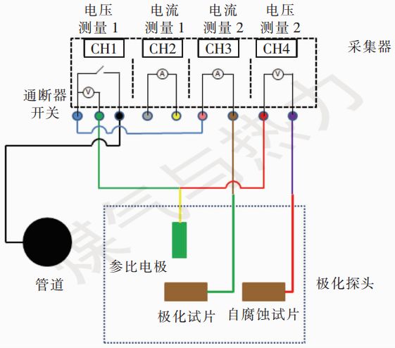 從圖1可以看出,極化試片通過(guò)棕色端子、粉色端子、藍(lán)色端子、通斷器開(kāi)關(guān)以及黑色端子之間的電纜與管道連接(其中電流測(cè)量模塊2內(nèi)部的高精度電流表內(nèi)阻可忽略不計(jì))。測(cè)量管道通電電位時(shí),電壓測(cè)量模塊1內(nèi)部ms級(jí)電路控制模塊的通斷器開(kāi)關(guān)合上,此時(shí)極化試片通過(guò)棕色端子、粉色端子、黑色端子之間的電纜與管道電連接,這就意味著極化試片與管道處于等電位狀態(tài),此時(shí)通過(guò)測(cè)量極化試片電纜與極化探頭的參比電極電纜之間電位差即可得到管道通電電位。測(cè)量極化電位時(shí),通過(guò)采集器內(nèi)部ms級(jí)電路控制模塊控制通斷器的開(kāi)關(guān)處于斷開(kāi)狀態(tài),并精準(zhǔn)控制極化試片與管道的斷開(kāi)時(shí)間,此時(shí)極化試片由于通斷器開(kāi)關(guān)斷開(kāi)而與管道之間處于斷開(kāi)的狀態(tài),利用采集器電壓測(cè)試模塊1測(cè)量斷電情況下極化試片電纜與極化探頭的參比電極電纜之間的電位差,即可獲得極化電位。測(cè)量自腐蝕電位時(shí),通過(guò)采集器內(nèi)部電壓測(cè)量模塊2測(cè)量極化探頭的自腐蝕試片電纜與極化探頭的參比電極電纜之間的電位差。測(cè)量直流電流密度(自腐蝕試片的面積數(shù)據(jù)已存儲(chǔ)在采集器中)時(shí),任意選用采集器內(nèi)部電流測(cè)量模塊1或者模塊2,圖1中是利用電流測(cè)量模塊2測(cè)量極化探頭內(nèi)極化試片與管道之間的直流電流密度。電流測(cè)量模塊2正極接粉色端子,粉色端子通過(guò)藍(lán)色端子、通斷器開(kāi)關(guān)以及黑色端子之間的電纜與管道相連,電流測(cè)量模塊2負(fù)極接極化試片。這就相當(dāng)于電流測(cè)量模塊2一端接管道,一端接極化試片,通過(guò)電流測(cè)量模塊2即可測(cè)量極化試片與管道之間的直流電流密度,并且利用電流測(cè)量模塊同時(shí)可測(cè)量出極化試片與管道之間的交流電流密度。