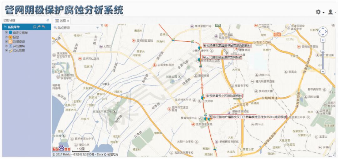 用戶(hù)通過(guò)終端軟件輸入用戶(hù)名和密碼即可登錄管網(wǎng)陰極保護(hù)腐蝕分析系統(tǒng)軟件。系統(tǒng)終端軟件首頁(yè)界面見(jiàn)圖2。系統(tǒng)以地圖平臺(tái)為界面,實(shí)現(xiàn)監(jiān)測(cè)點(diǎn)地理位置信息展示,從該界面可直觀看出管道的走向路由及與地鐵線路的位置關(guān)系。界面左側(cè)提供報(bào)警、數(shù)據(jù)查詢(xún)、數(shù)據(jù)分析評(píng)估查詢(xún)及現(xiàn)場(chǎng)設(shè)備點(diǎn)后臺(tái)管理的入口。