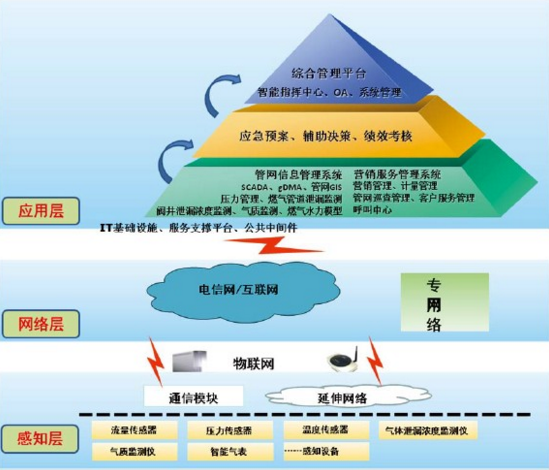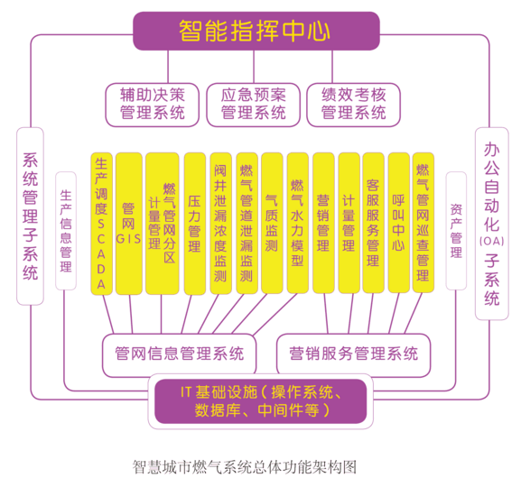 智慧城市燃?xì)庀到y(tǒng)主要由十大應(yīng)用系統(tǒng)共21個(gè)子系統(tǒng)組成,即生產(chǎn)領(lǐng)域的管網(wǎng)信息管理系統(tǒng);服務(wù)領(lǐng)域的營(yíng)銷(xiāo)服務(wù)管理系統(tǒng);領(lǐng)導(dǎo)決策支持的應(yīng)急預(yù)案管理系統(tǒng)、輔助決策管理系統(tǒng)、績(jī)效考核管理系統(tǒng);統(tǒng)一指揮調(diào)度的智能指揮中心系統(tǒng);自動(dòng)化辦公的OA系統(tǒng)和系統(tǒng)管理支撐子系統(tǒng)。