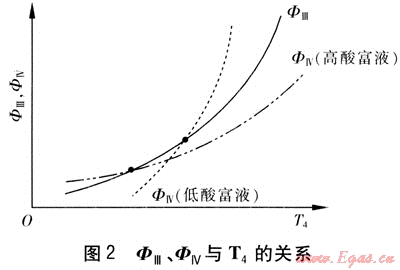 上式中T4按ФⅢ、ФⅣ方程擬合曲線求交點(diǎn)的方法求取,ФⅢ、ФⅣ與死的關(guān)系見(jiàn)圖2。若所求交點(diǎn)溫度乃滿足熱平衡方程ФⅢ=ФⅣ,則T4即為填料層頂溫度。