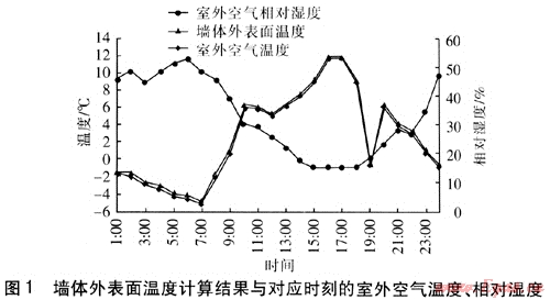 為了對太陽輻射條件下墻體外表面向內(nèi)側(cè)的傳熱量進行分析,選定墻體結(jié)構(gòu)及材料熱工性能參數(shù)見表1,熱工性能參數(shù)滿足DB 63/643—2007《青海省居住建筑節(jié)能設(shè)計標準》。墻體外表面為淺色涂料,建筑物四周為綠色草坪。墻體外表面溫度采用有限差分法進行計算,并采用ANSYS計算軟件對結(jié)果進行校核。墻體外表面溫度計算結(jié)果與對應(yīng)時刻的室外空氣溫度、相對濕度見圖1。