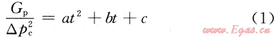 S6區(qū)塊是蘇里格氣田最早投產(chǎn)的區(qū)塊,其地質(zhì)條件與蘇里格氣田其他區(qū)塊相似,氣井的生產(chǎn)動(dòng)態(tài)也基本相似。S6區(qū)塊第一批生產(chǎn)井于2002年投產(chǎn),生產(chǎn)期已超過(guò)7a,氣井的滲流邊界已達(dá)到或接近真實(shí)的氣藏邊界,處于低壓低產(chǎn)中后期。在實(shí)際生產(chǎn)中,絕大部分氣井只進(jìn)行了井口油套壓和產(chǎn)量的監(jiān)測(cè),對(duì)氣井的生產(chǎn)數(shù)據(jù)進(jìn)行分析,發(fā)現(xiàn)氣井的單位套壓降采氣量(Gp/△pc2)隨生產(chǎn)時(shí)間動(dòng)態(tài)變化,兩者之間呈良好的二次多項(xiàng)式關(guān)系,相關(guān)系數(shù)大于0.96。即