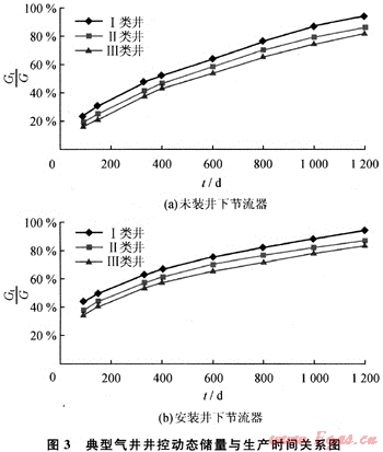 氣井在各生產(chǎn)階段的單位套壓降產(chǎn)氣量的變化規(guī)律直接反映了氣井井控動(dòng)態(tài)儲(chǔ)量隨生產(chǎn)時(shí)間變化的規(guī)律。采用FAST.RTA軟件對(duì)這些氣井進(jìn)行動(dòng)態(tài)分析,求得不同生產(chǎn)時(shí)間的井控動(dòng)態(tài)儲(chǔ)量(Gt),發(fā)現(xiàn)Gt-t與Gt/△pc2-t有相同的變化規(guī)律,Gt在早期隨生產(chǎn)時(shí)間t增加而快速增大,后期逐漸趨緩變平,兩者之間呈良好的二次多項(xiàng)式關(guān)系;當(dāng)Gt不再隨生產(chǎn)時(shí)間增大時(shí),可認(rèn)為已達(dá)到了最大井控動(dòng)態(tài)儲(chǔ)量,記為Gt歸納這些氣井的Gt/G-t關(guān)系,可得到3類(lèi)典型氣井井控動(dòng)態(tài)儲(chǔ)量隨生產(chǎn)時(shí)間變化的關(guān)系圖版。在研究過(guò)程中發(fā)現(xiàn)氣井的生產(chǎn)制度對(duì)井控動(dòng)態(tài)儲(chǔ)量的變化規(guī)律有較大影響,氣井初始配產(chǎn)越高,其初始階段的井控動(dòng)態(tài)儲(chǔ)量和泄流面積越小。蘇里格早期投產(chǎn)井大部分未安裝井下節(jié)流器,初始配產(chǎn)較高,而近年來(lái)投產(chǎn)的氣井普遍采用了井下節(jié)流技術(shù),初始配產(chǎn)較低(圖3)。