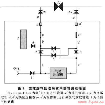 回收裝置通過(guò)耐壓金屬軟管,分別與隔離閥門(mén)兩側(cè)(檢修側(cè)、運(yùn)行側(cè))的放散閥門(mén)管道連接,位于檢修側(cè)(A2)為進(jìn)氣管路,運(yùn)行側(cè)(A1)則為排氣管路。金屬軟管借助于特制的快速連接器與放散管道相連接,選擇不同口徑的快速連接器接頭,可實(shí)現(xiàn)同一條金屬軟管管與不同管徑放散管道快速聯(lián)通,以節(jié)省安裝時(shí)間。